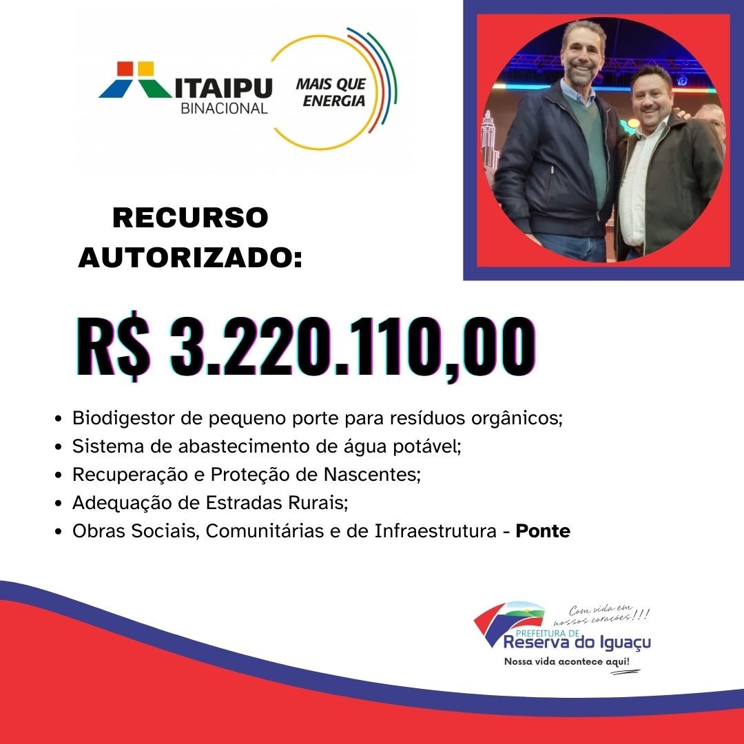 Com imensa satisfação, o Prefeito Vitorio Antunes de Paula em nome da Administração Municipal, anuncia que o Município de Reserva do Iguaçu foi contemplado com Recurso no valor de R$ 3.220.110,00 (três milhões, duzentos e vinte mil e cento e dez reais) no Programa Itaipu Mais que Energia.