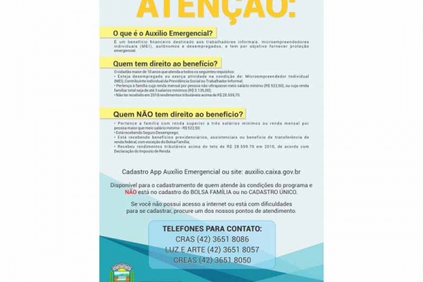 A Secretaria Municipal de Assistência Social auxiliará as pessoas que queiram o Auxílio Emergencial