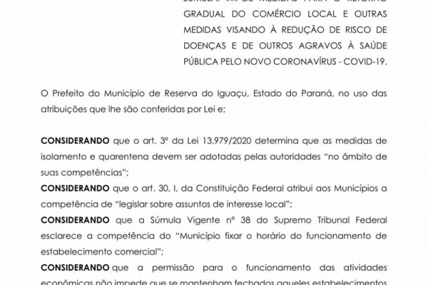 Prefeito Municipal impõe medidas para o RETORNO GRADUAL, com providências de prevenção, do comércio