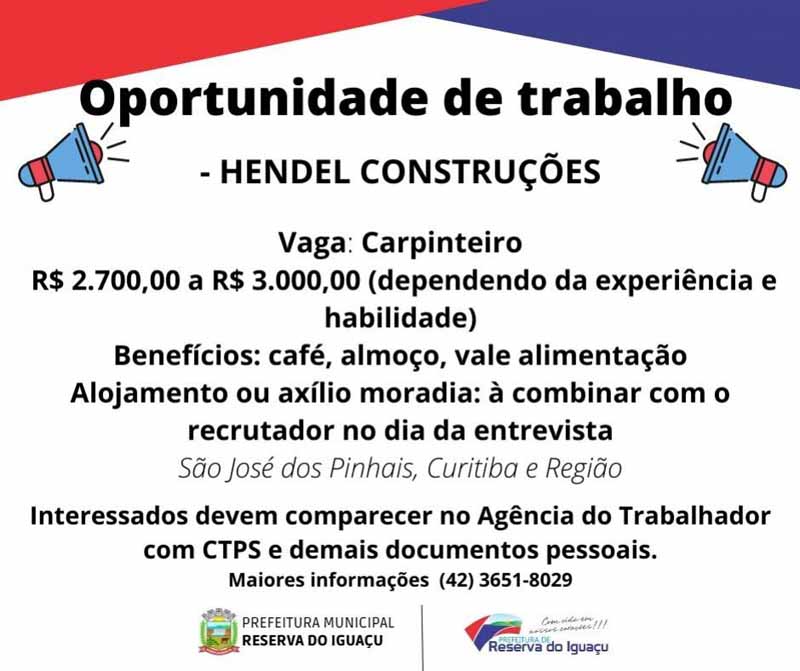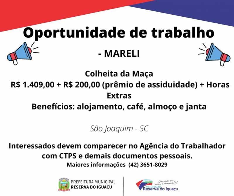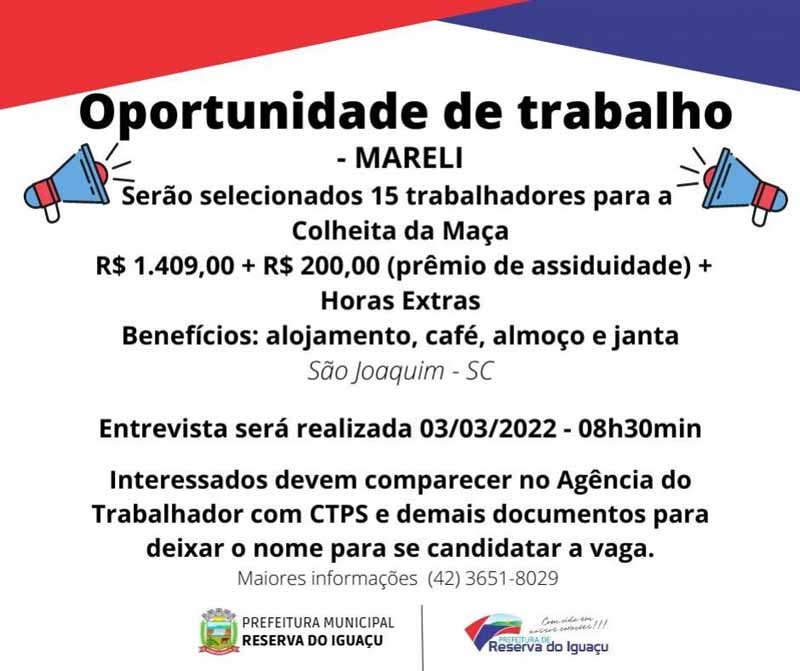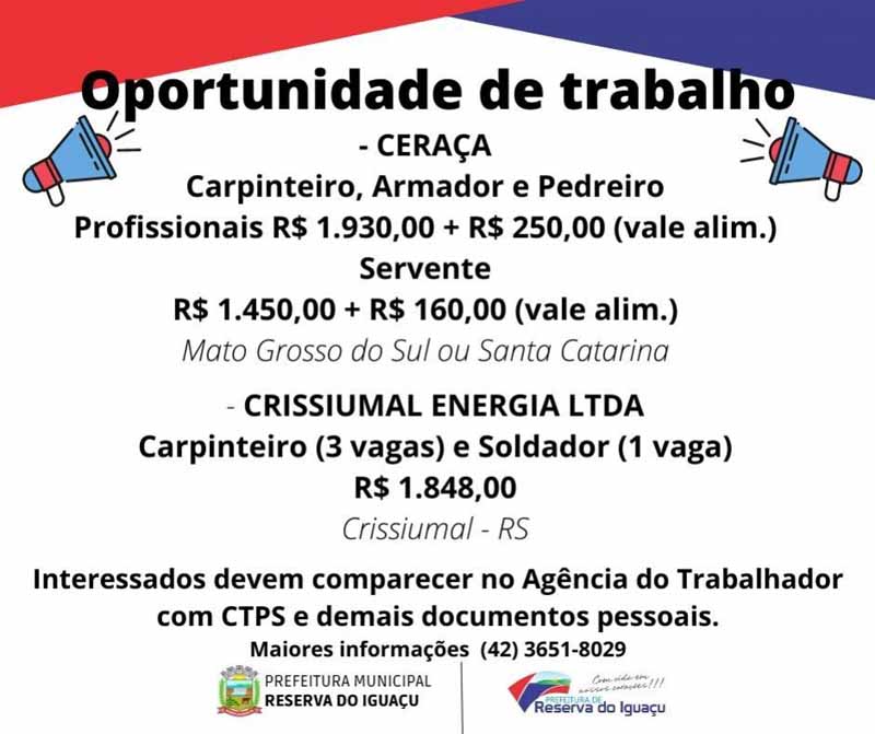 Maiores informações na Agência do Trabalhador (ao lado da Cresol) ou pelo telefone 3651-8029.