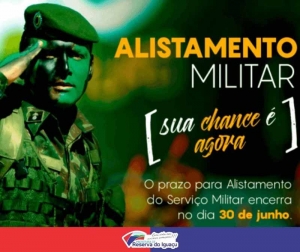 A Junta Militar informa que o prazo para o Alistamento Militar 2022 termina nesta quinta (30). Todos os jovens com 18 anos, nascidos em 2004, independente do mês do aniversário, devem fazer o alistamento até 30 de junho.