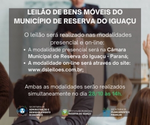 A Administração Municipal informa a todos os interessados que dia 28/10 (sexta-feira) às 14 horas terá início o Leilão de Bens Móveis Inservíveis do Município.