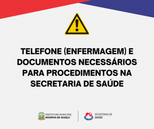 Pedimos também aos munícipes que quando forem realizar qualquer procedimento na Secretaria de Saúde é necessário levar os seguintes documentos: RG, CPF e Cartão do SUS.