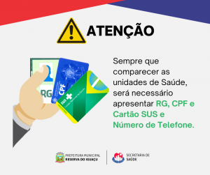 A Secretaria de Saúde informa que SEMPRE que comparecer as unidades de Saúde, será necessário apresentar RG, CPF e Cartão SUS e Número de Telefone.