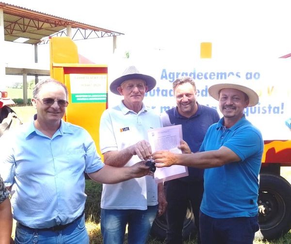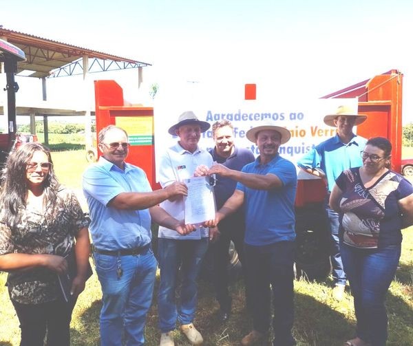 Na manhã de hoje (24/01), o Prefeito Vitório Antunes de Paula, juntamente com o sr. Vitorino Coradin Assessor do Deputado Federal Enio Verri e o Secretário Municipal de Agropecuária e Desenvolvimento Rural Clairton Pedrozo de Quadros, realizaram a entrega de Trator e Carreta Agrícola para a Associação Nova Conquista da Comunidade Assentamento Paineira.