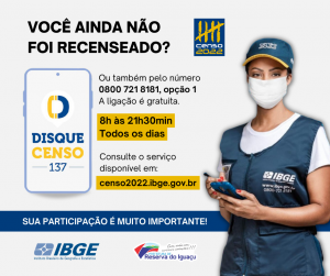 O Censo Demográfico 2022 está sendo finalizado, se você ainda não foi recenseado Ligue para o nº 137.