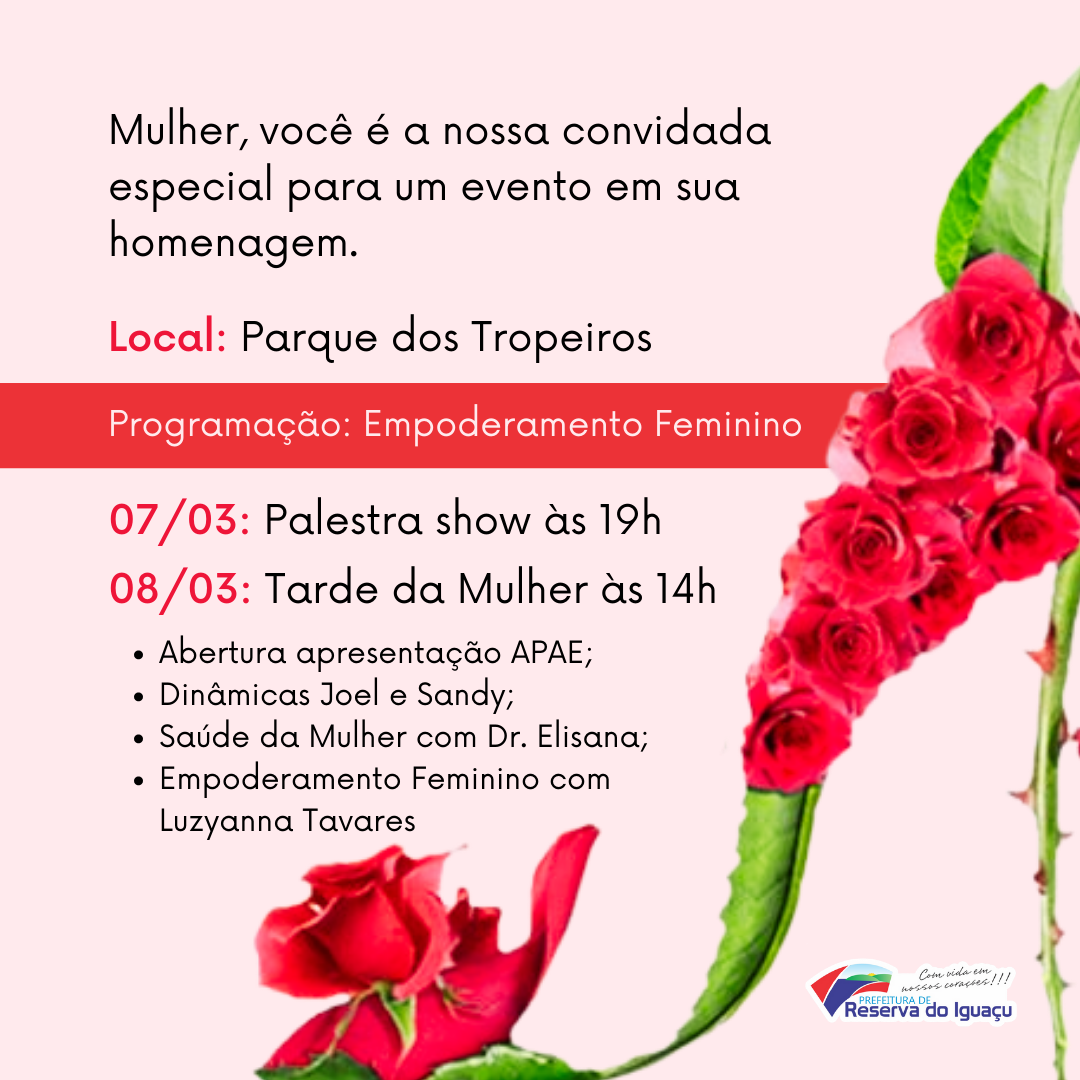 A Administração Municipal convida você, mulher para um evento em sua homenagem.