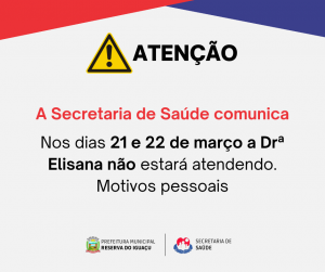 A Secretaria de Saúde comunica Nos dias 21 e 22 de março a Drª Elisana não estará atendendo. Motivos pessoais