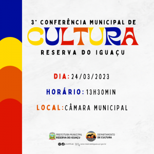 A Secretaria Municipal de Educação RI e o Conselho Municipal de Cultura de Reserva do Iguaçu - PR convidam para participar da 3° Conferência Municipal de Cultura com o tema: O CPF da Cultura e as leis de incentivo cultural.