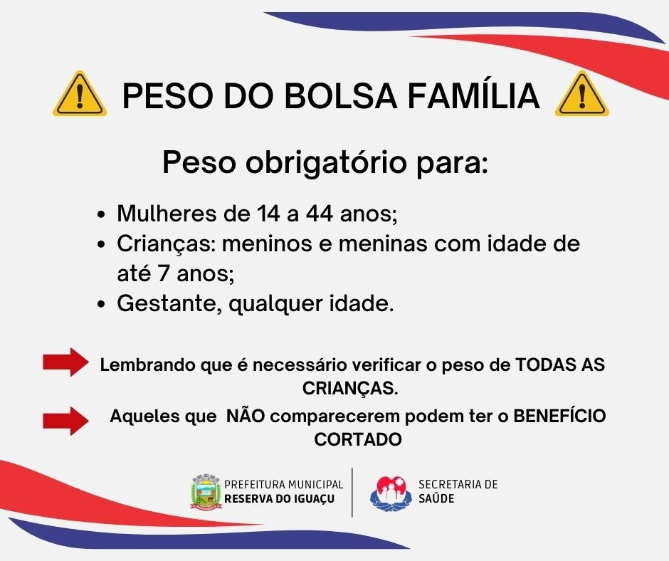 É obrigatória a pesagem para: Mulheres de 14 a 44 anos; Crianças: meninos e meninas com idade de até 7 anos; Gestante, qualquer idade.