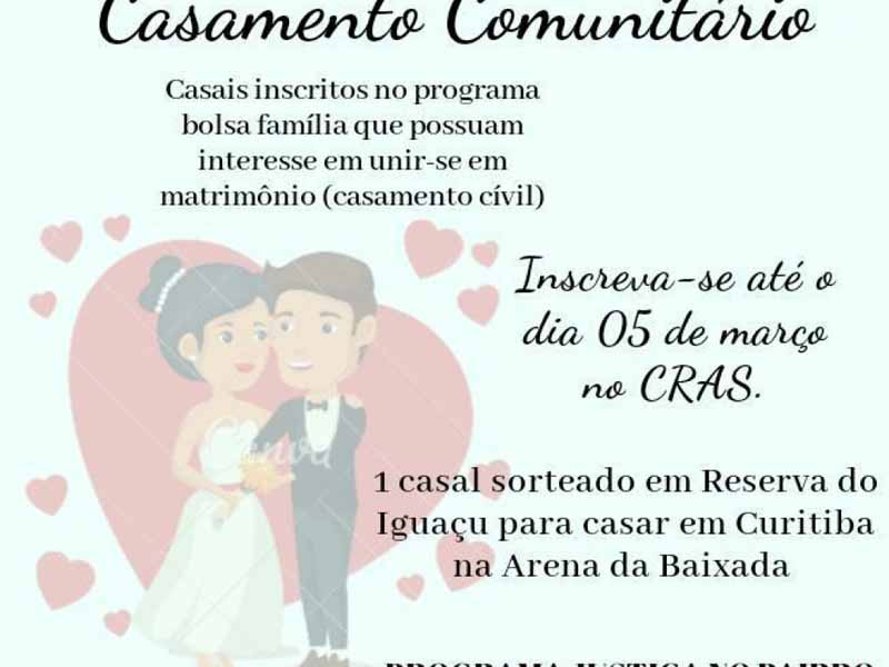 O CRAS – Centro de Referência da Assistência Social CONVIDA aos casais que fazem parte do Programa Bolsa Família que tiverem interesse de casar-se no civil, comparecer no CRAS até a data de 05 de março. O Município de Reserva do Iguaçu aderiu ao Programa Justiça no Bairro - CASAMENTO COLETIVO, qual irá disponibilizar acesso a 1 (um) casal reservense, para se unir em matrimonio de forma gratuita na cidade de Curitiba, no Estádio do Atlético Paranaense. A seleção será por meio de sorteio dos inscritos.