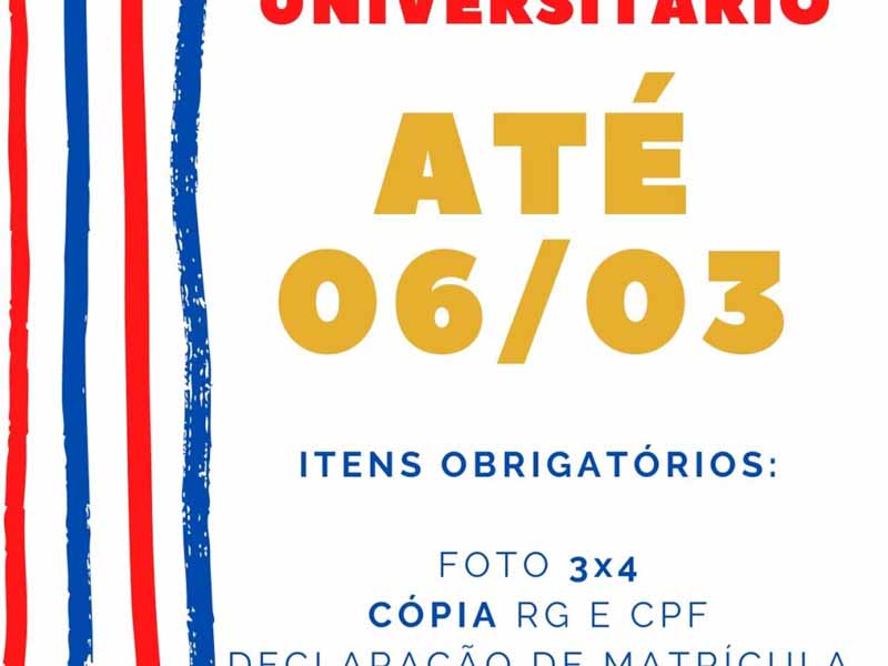 Já estão em andamento as confecções das Carteirinhas do Transporte Universitário e estará sendo realizada na Secretaria Municipal de Educação, o prazo é até dia 06/03 (sexta feira), sem extensão de prazo.