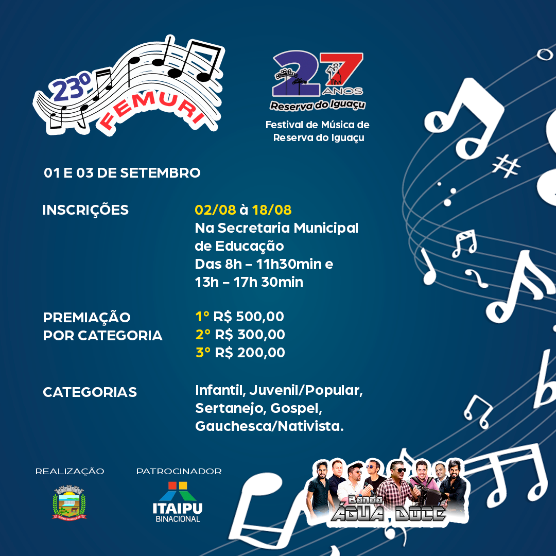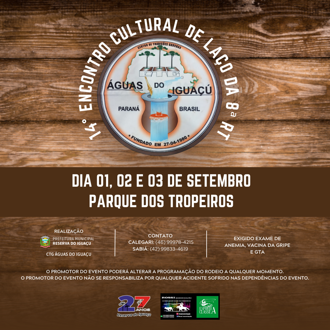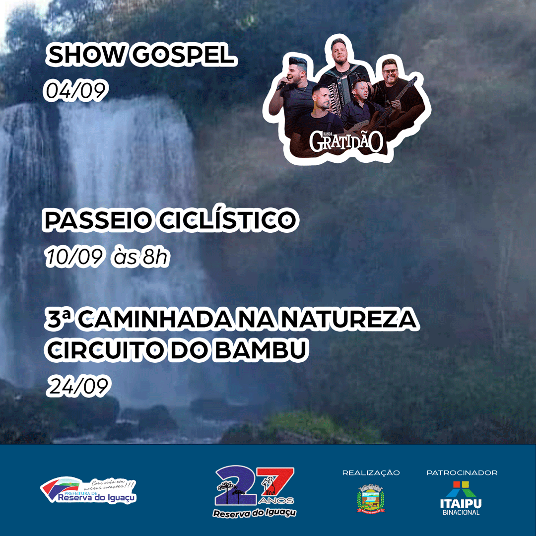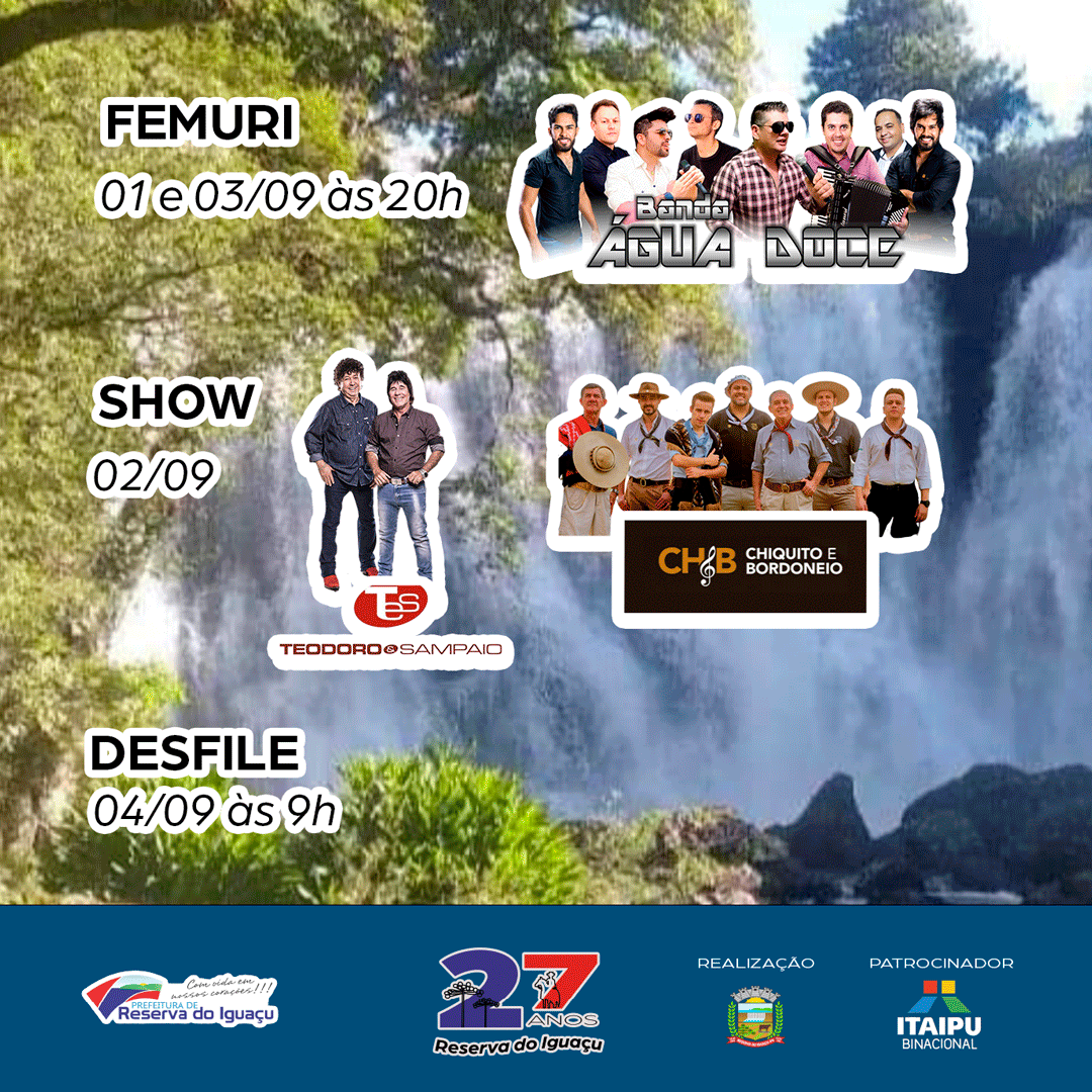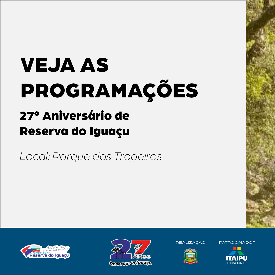 Com muita alegria, o Prefeito Vitório Antunes de Paula, em nome da Administração Municipal, divulga a programação do 27º Aniversário de Reserva do Iguaçu.