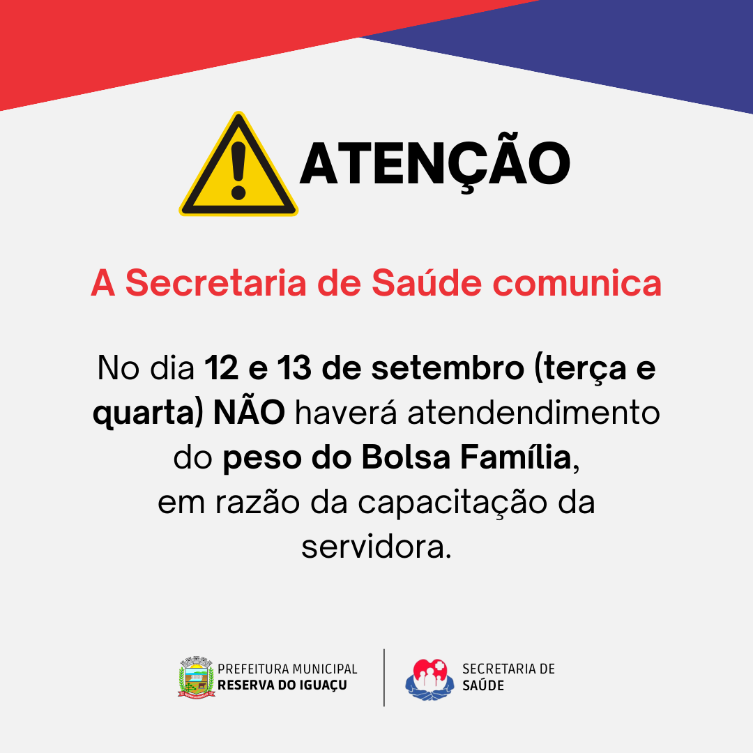 Nos dias 12 e 13 de setembro (terça e quarta) NÃO haverá atendimento do Peso do Bolsa Família, em razão da capacitação da servidora.