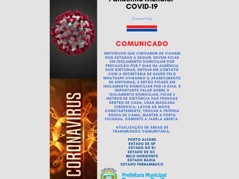 Indivíduos que chegarem de viagem dos estados a seguir, devem ficar em isolamento domiciliar por precaução por 7 dias na ausência dos sintomas, entrar em contato com a secretária de saúde pelo whatsapp avisando o aparecimento de sintomas, e então ficará em isolamento domiciliar por 14 dias. É importante falar sobre o isolamento domiciliar, ficar 2 metros de distância das pessoas dentro de casa, usar máscara cirúrgica, lavar as mãos constantemente, trocar a própria roupa de cama, manter a porta fechada, somente a janela aberta.