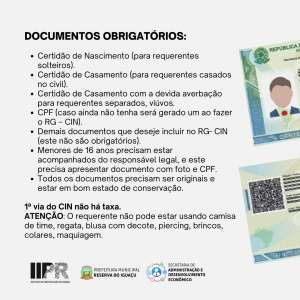 - CPF (caso ainda não tenha será gerado um ao fazer o RG – CIN).