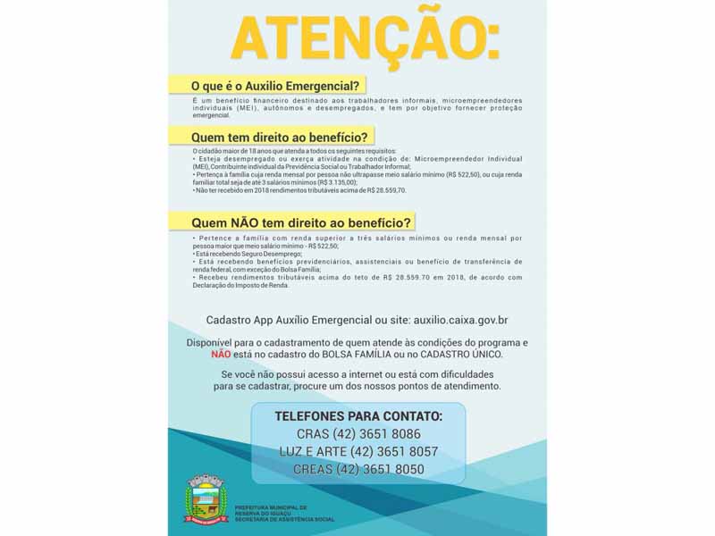 A Secretaria Municipal de Assistência Social de Reserva do Iguaçu pensando em auxiliar as pessoas que estão com dificuldade no cadastro dos beneficiários do Auxílio Emergencial, benefício para Microempreendedores Individuais (MEI), autônomos e informais, criou pontos de orientação.