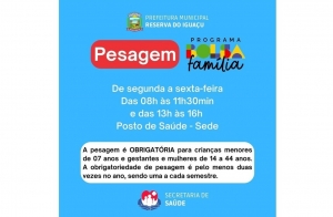 A pesagem pode ser feita de segunda a sexta-feira das 08h às 11h30min e das 13h às 16h no Posto de Saúde - Sede.