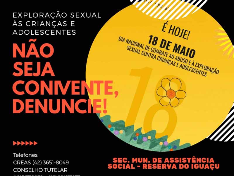 A Campanha também visa divulgar os canais de denúncias, tanto no âmbito municipal, quanto Nacional. Em Reserva do Iguaçu, podemos denunciar no Conselho Tutelar pelo telefone (42) 3651-8059, no CRAS pelo telefone (42) 3651-8086, no CREAS – pelo telefone (42) 3651-8049 e na Polícia Militar, pelo telefone (42) 3651-1402. Na esfera Nacional, podemos denunciar no Disque Direitos Humanos – o Disque 100 – serviço gratuito que funciona 24h nos sete dias da semana para receber denúncias de violência contra crianças e adolescentes.