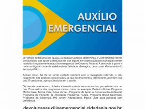 O Prefeito de Reserva do Iguaçu, Sebastião Campos, determinou à Controladoria Interna do Município que apure a denúncia de que alguns servidores públicos municipais teriam recebido irregularmente o auxílio emergencial do Governo Federal. A denúncia é grave e pode configurar crime de estelionato e falsidade ideológica, bem como afastamento do serviço público.