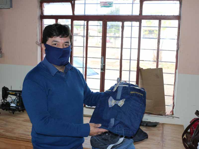 A Prefeitura disponibiliza as maquinas de costura e cursos de profissionalização. Sebastião também doou algumas calças e doou retalhos de diferentes tamanhos para as costureiras que ali trabalham, incentivando a produção de materiais a serem confeccionados artesanalmente.